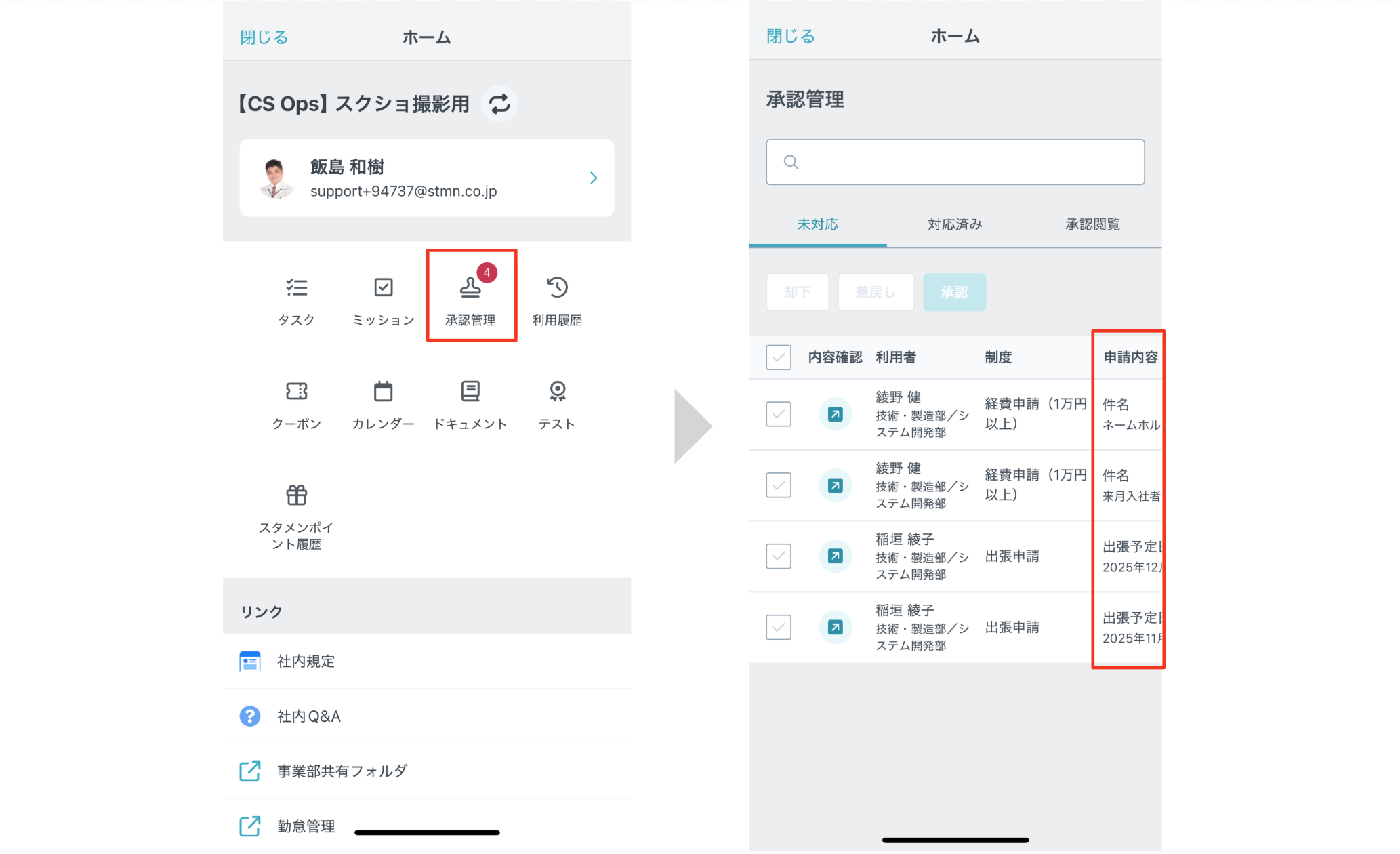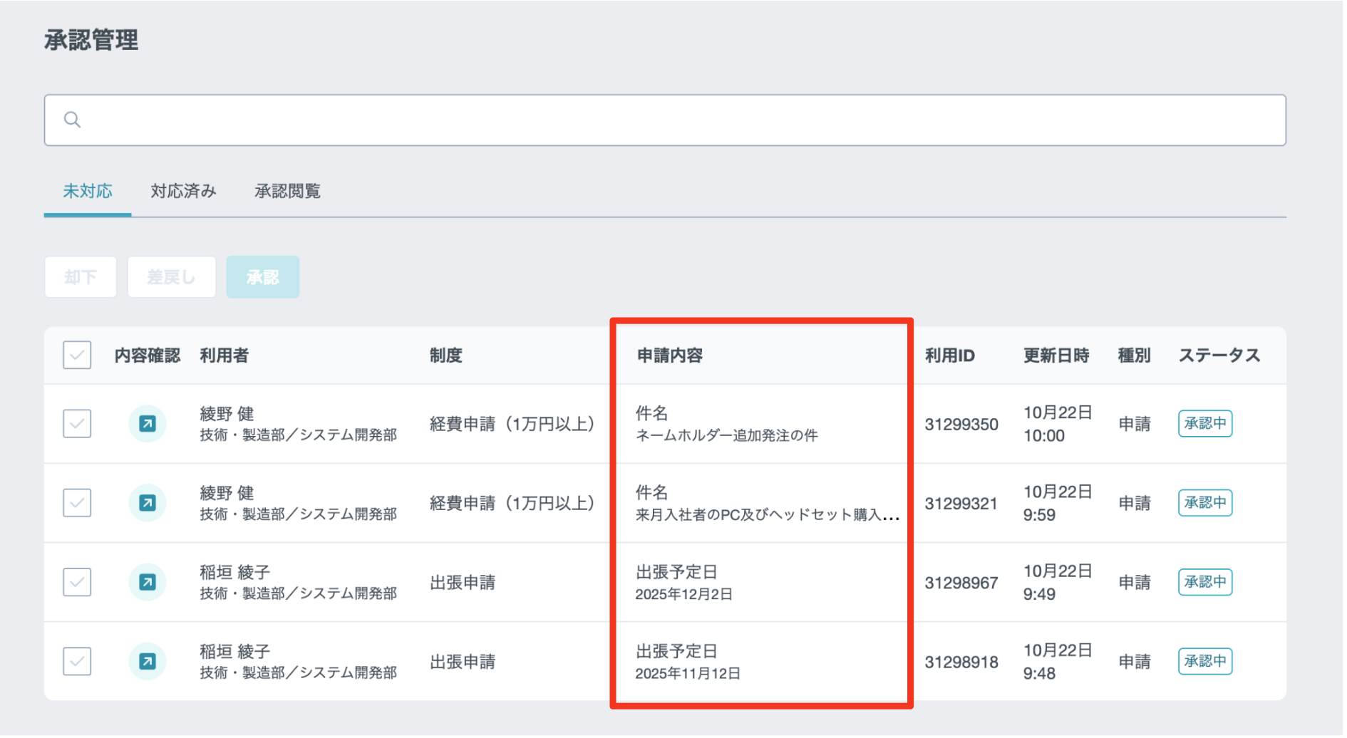 承認管理画面において、申請内容の最初の項目名及び入力内容の冒頭部分を確認できるようになりました。