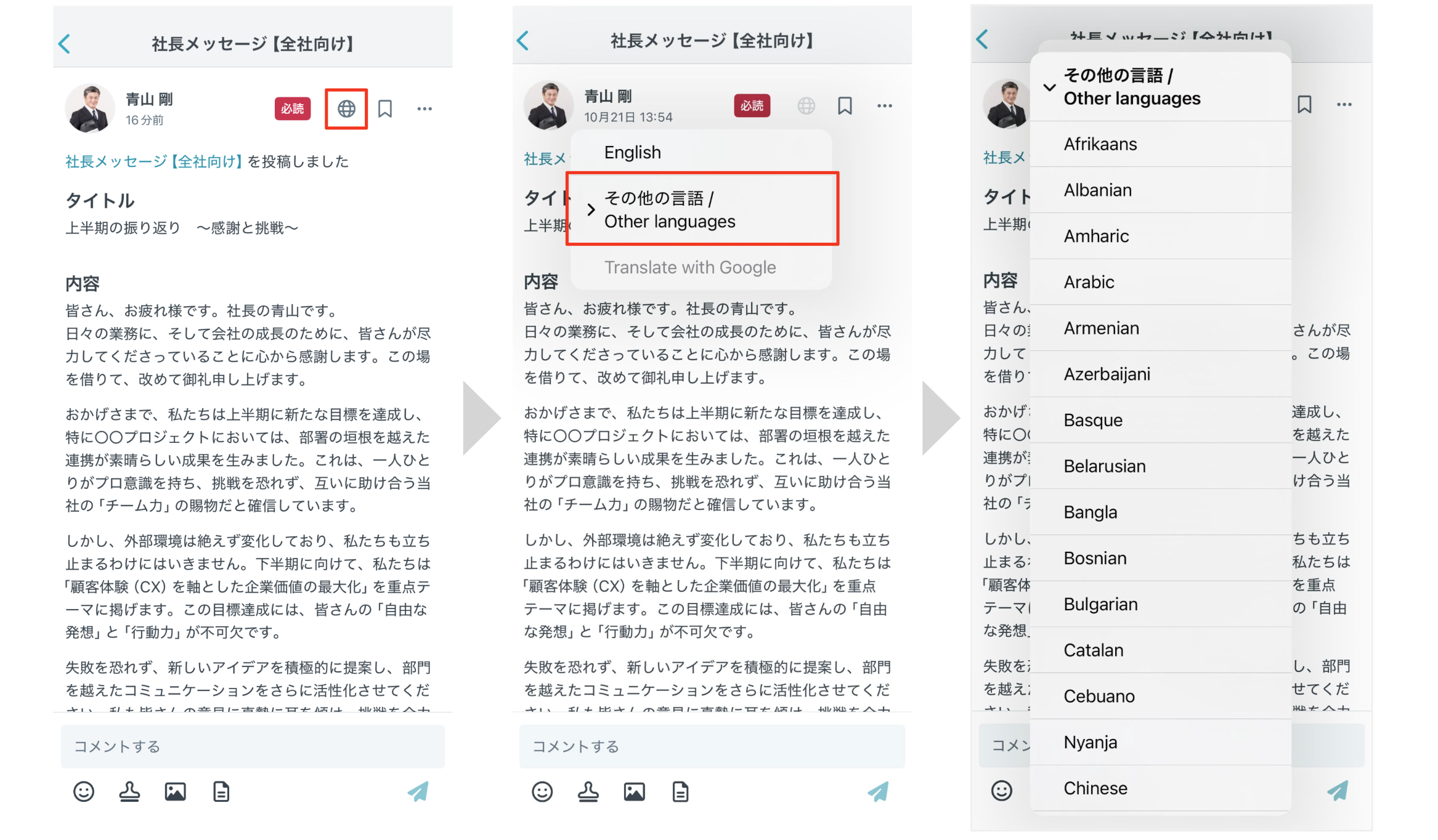 約100の言語からユーザーご自身で馴染みのある言語を選んで翻訳することが可能です。