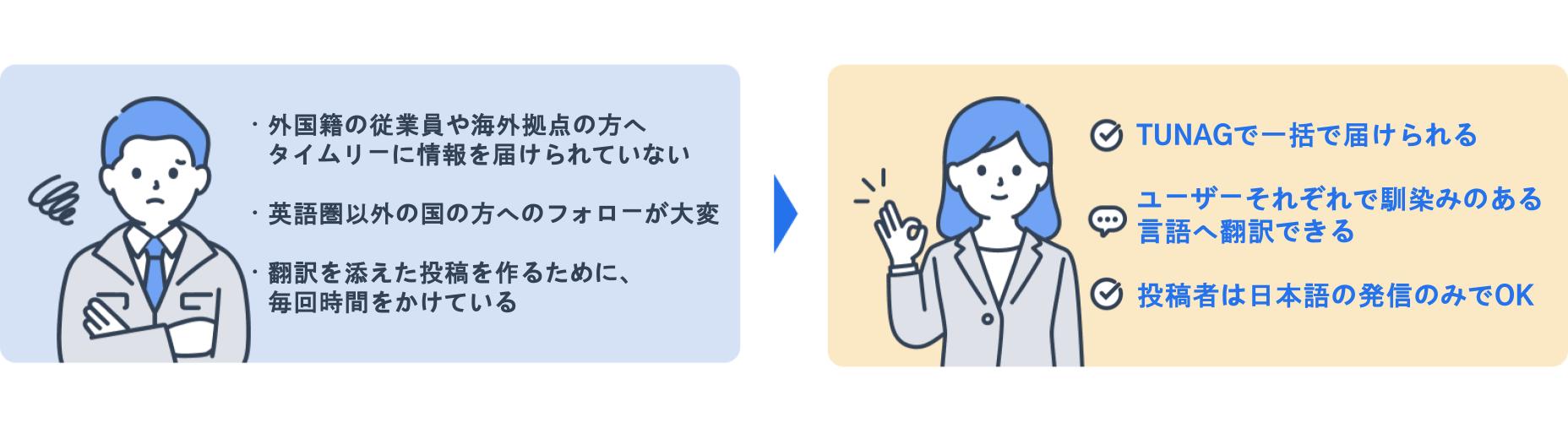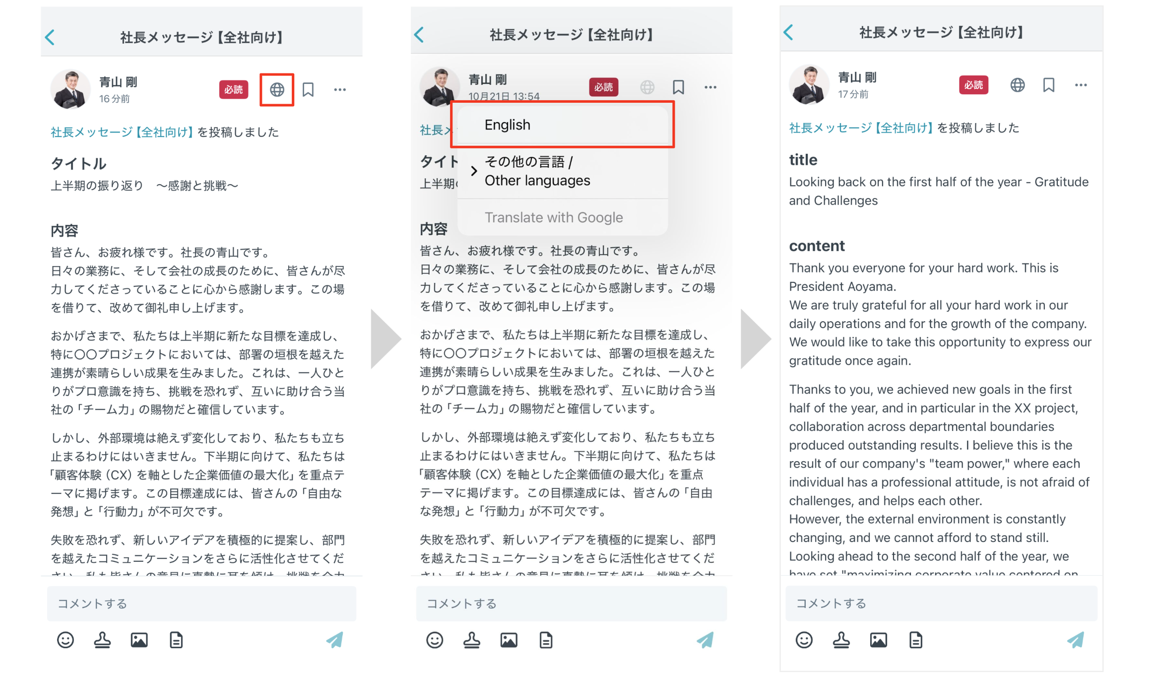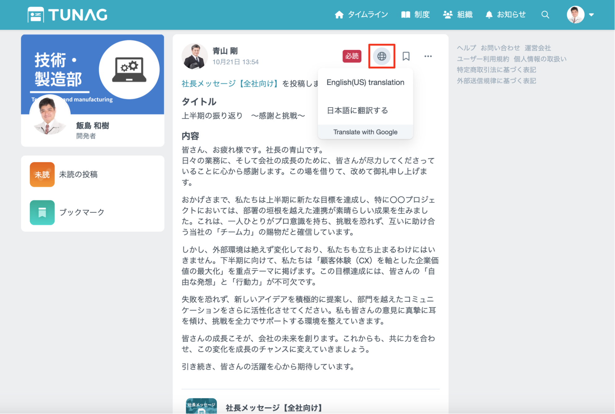 翻訳機能では、TUNAGの投稿・コメントを画面上でかんたんに翻訳して閲覧できます。