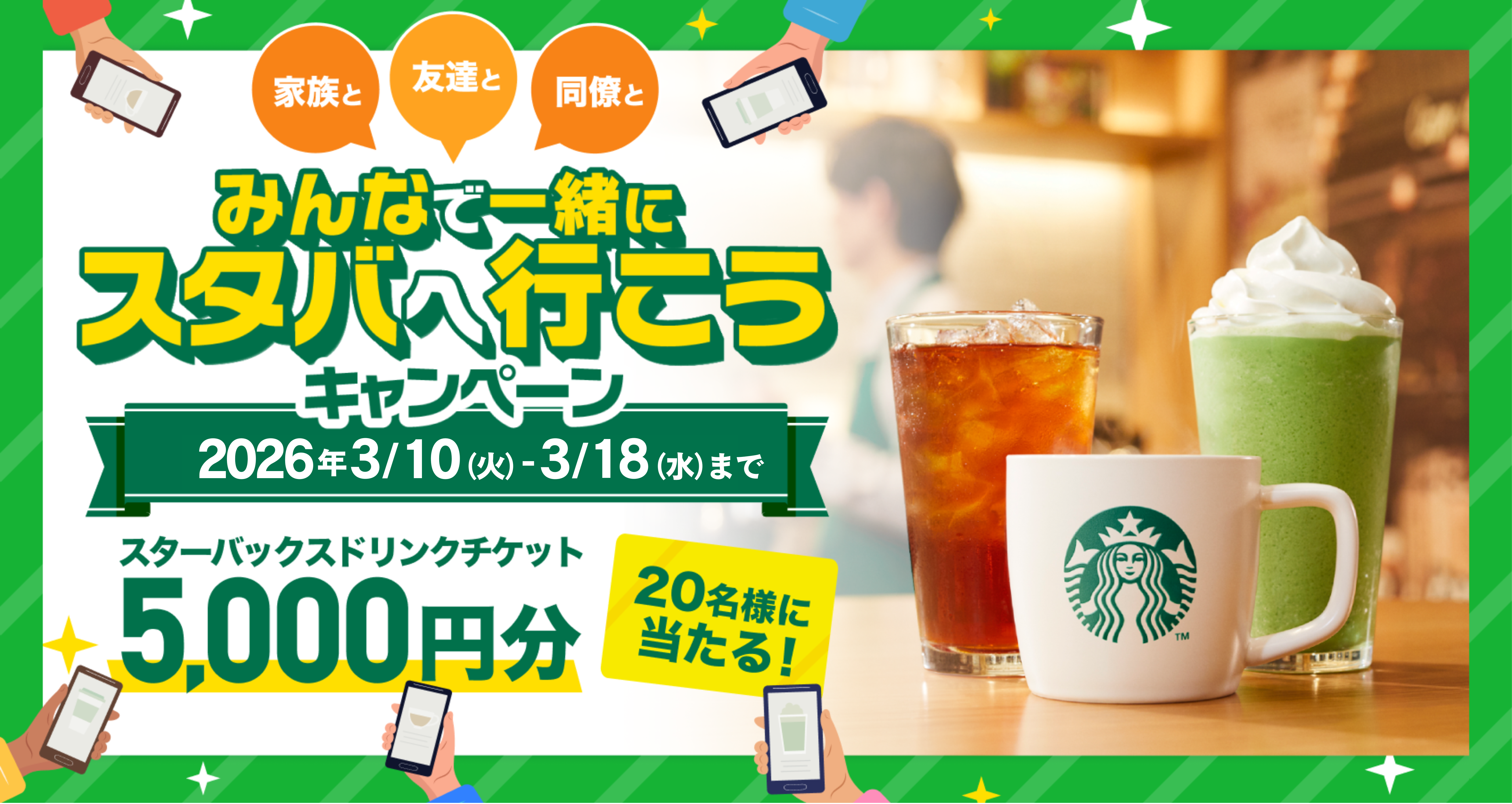 日頃のご愛顧に感謝を込めて、3/10(火)〜3/18(水)で、スタバドリンクチケット5,000円分が当たる抽選開催✨